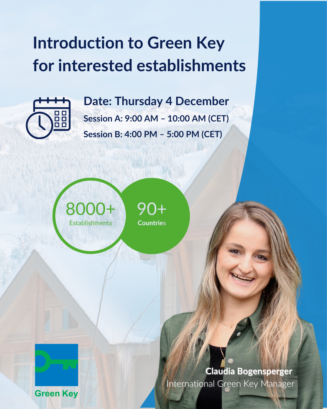 Green Key International hosts quarterly intro sessions to give a short introduction to the Green Key programme: criteria and certification process, participation costs, support tools, benefits of Green Key, how to get started and contact information. After the presentation, there is time for a Q&A session.